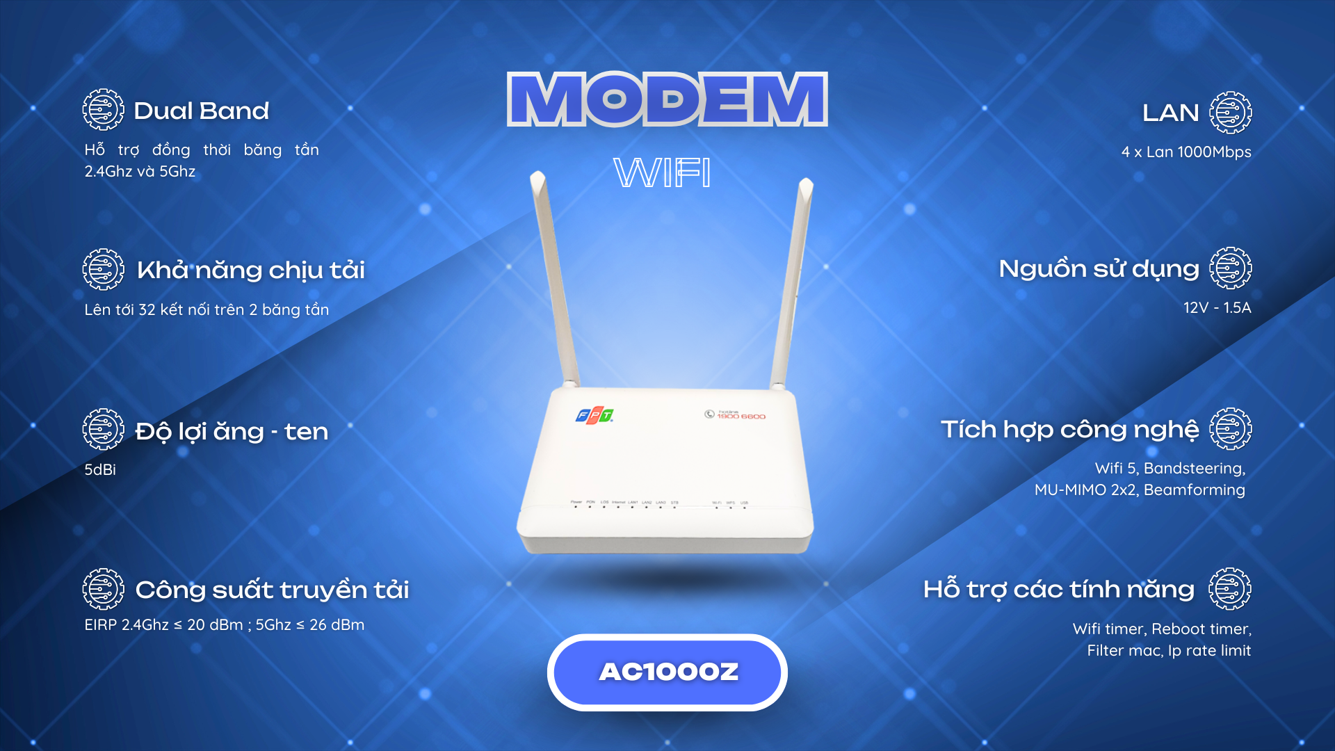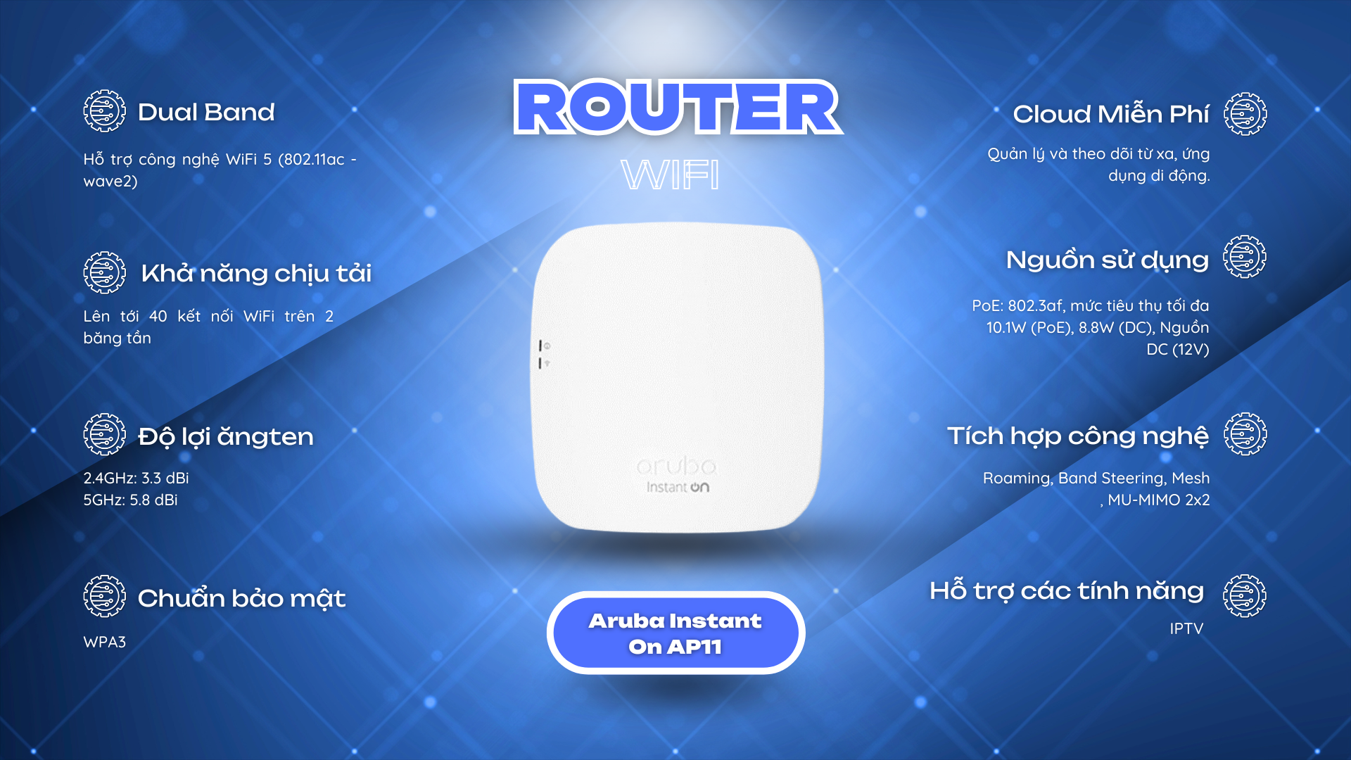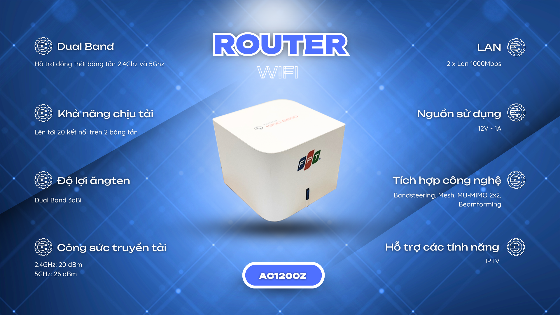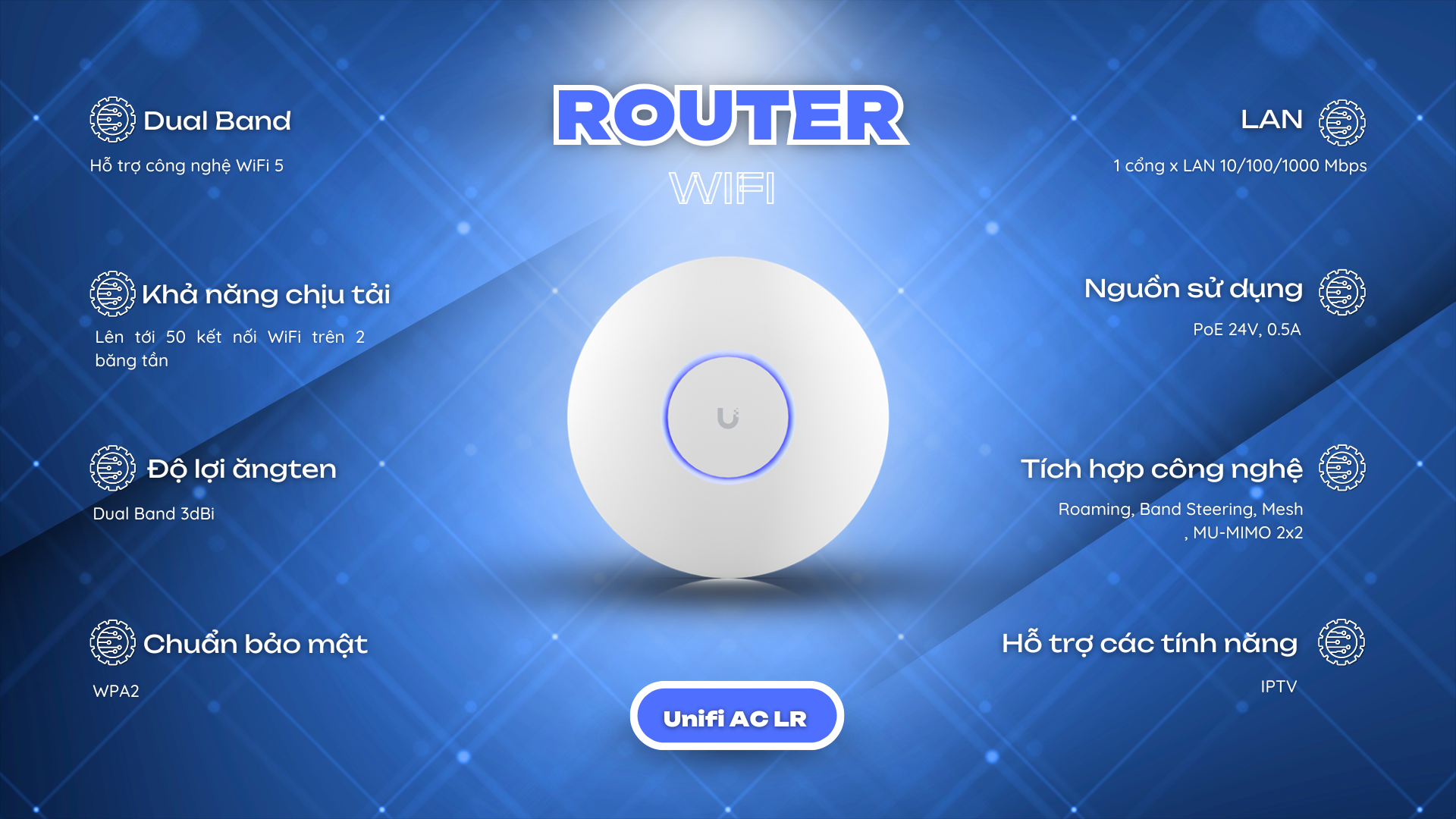 Công nghệ Wifi 5 là công nghệ thế hệ thứ 5 , ứng dụng và hoạt động đồng thời cùng một lúc trên hai băng tần 5Ghz và 2.4Ghz , hỗ trợ MU-MIMO , vùng phủ sóng rộng và tương thích hoàn toàn với các chuẩn Wifi cũ ( a/b/g/n)