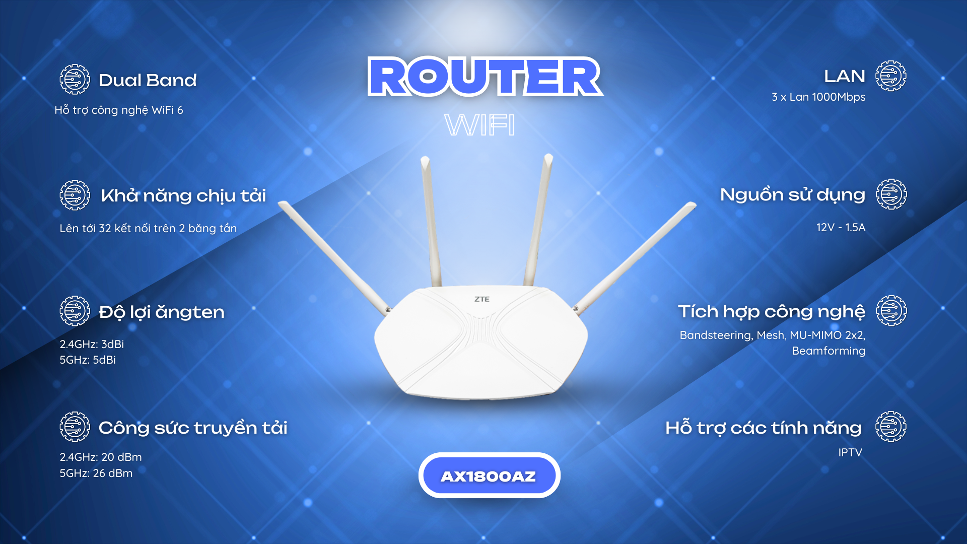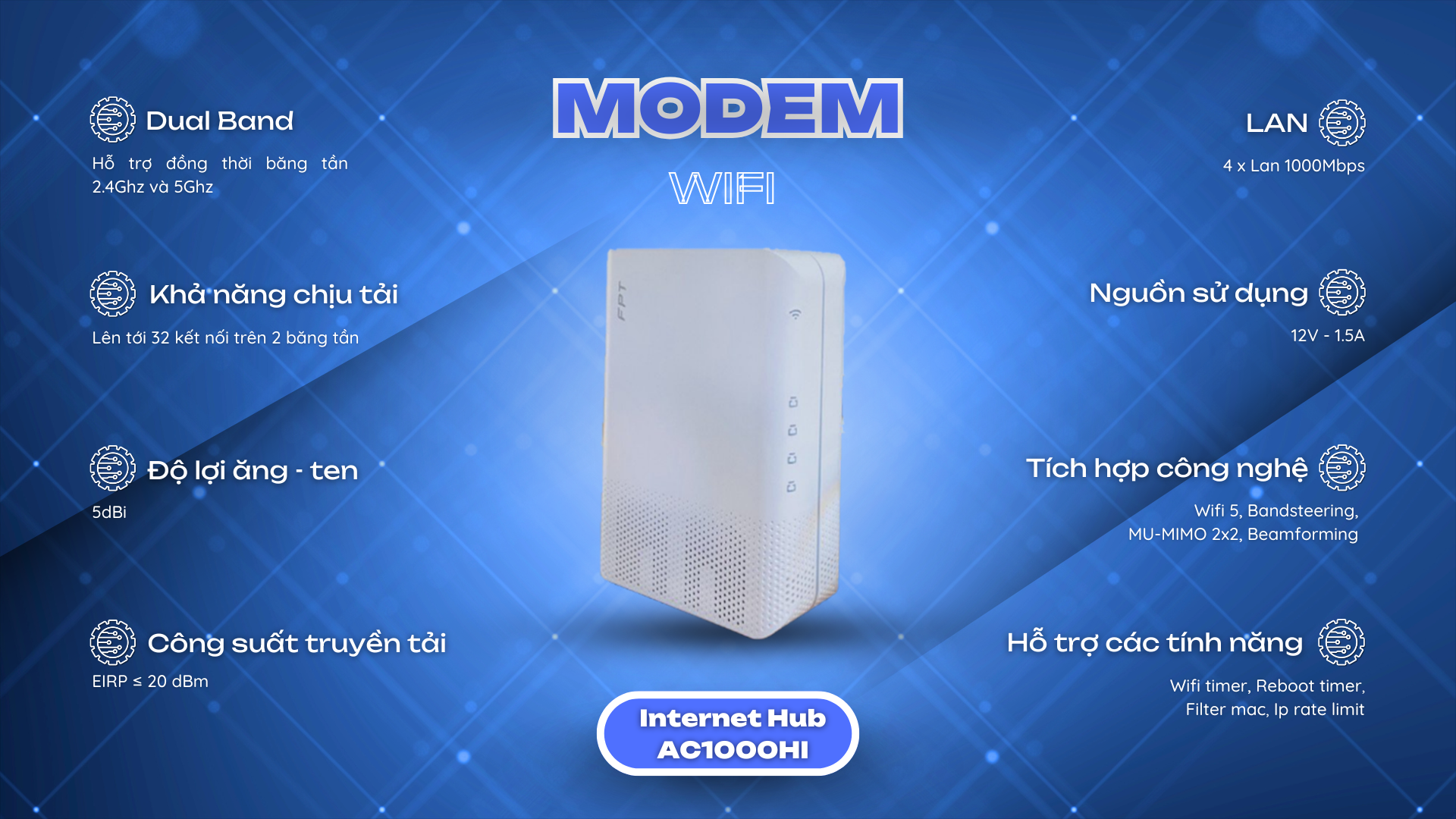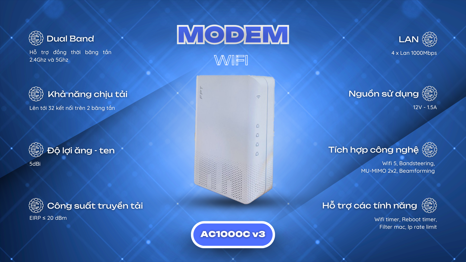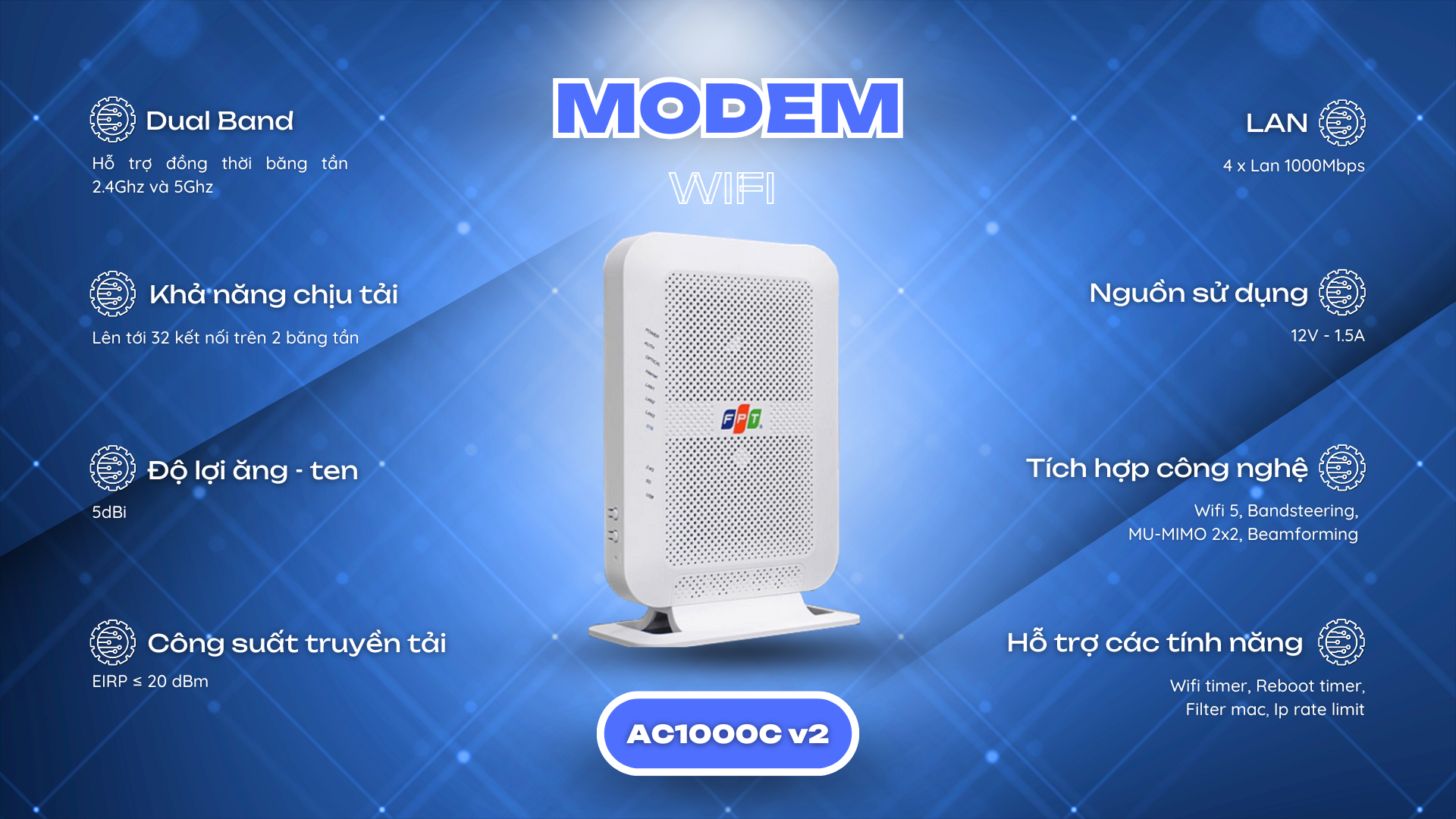 Công nghệ Wifi 5 là công nghệ thế hệ thứ 5 , ứng dụng và hoạt động đồng thời cùng một lúc trên hai băng tần 5Ghz và 2.4Ghz , hỗ trợ MU-MIMO , vùng phủ sóng rộng và tương thích hoàn toàn với các chuẩn Wifi cũ ( a/b/g/n)
